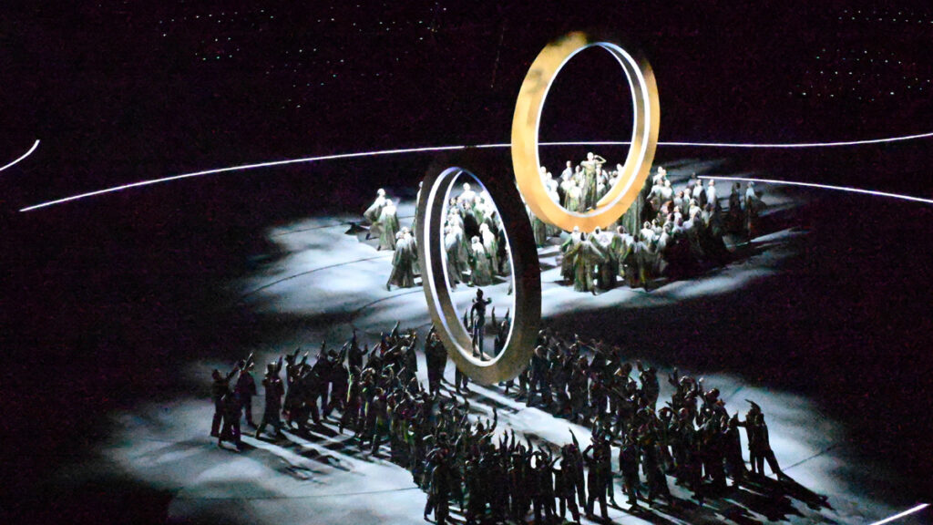 Στις 21:00 ώρα Ελλάδας, στο κέντρο του μιλανέζικου σταδίου, δεκάδες καλλιτέχνες ανέβηκαν σε μία σπειροειδή κατασκευή που εκτεινόταν σε τέσσερις βραχίονες, ανοίγοντας συμβολικά προς τις δευτερεύουσες σκηνές, φωλιασμένες στο χιόνι εκατοντάδες χιλιόμετρα μακριά από την πρωτεύουσα της Λομβαρδίας.