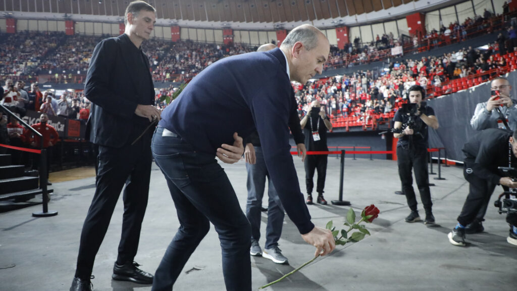 Σύσσωμη η οικογένεια της ομάδας άφησε από ένα τριαντάφυλλο στο πανό που υπήρχε στο ΣΕΦ για τους αδικοχαμένους φιλάθλους του συλλόγου
