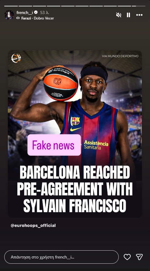 Ωστόσο, η απάντηση ήρθε αμέσως. Ο Φρανσίσκο προέβη σε ανάρτηση στα social media, κάνοντας λόγο για «fake news» και ξεκαθαρίζοντας ότι δεν υπάρχει καμία συμφωνία. Στο ίδιο μήκος κύματος κινήθηκε και ο Ραζνάτοβιτς, ο οποίος -επίσης με δημόσια τοποθέτησή του- χαρακτήρισε ψευδείς τις πληροφορίες.
