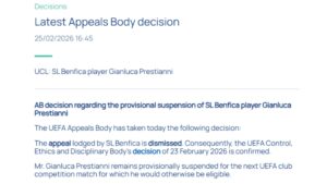 Ο κ. Gianluca Prestianni παραμένει προσωρινά αποκλεισμένος για τον επόμενο αγώνα της UEFA σε διασυλλογική διοργάνωση για τον οποίο διαφορετικά θα ήταν επιλέξιμος».