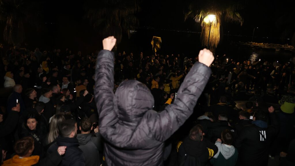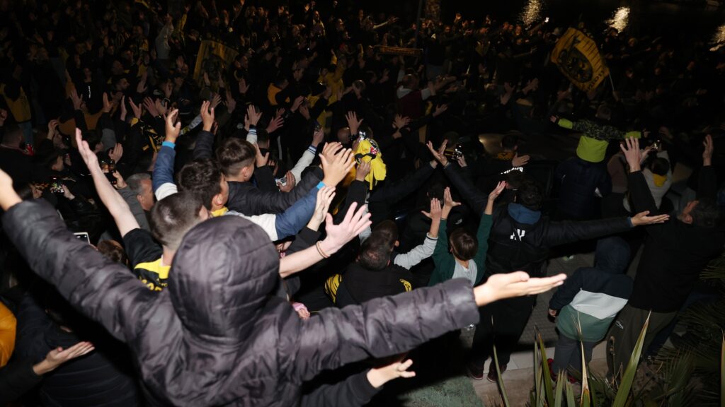 Η… απόβαση στον Βόλο ξεκίνησε από το βράδυ του Σαββάτου (28/02), με εκατοντάδες φίλους της ΑΕΚ να συγκεντρώνονται έξω από το ξενοδοχείο της ομάδας, περιμένοντας να φτάσει η αποστολή για να αποθεώσουν τον Μάρκο Νίκολιτς και τους παίκτες του.