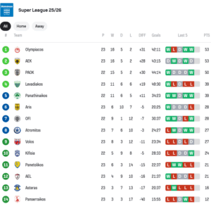 Εφόσον τα καταφέρει θα πάμε σε τριπλή ισοβαθμία στην κορυφή του βαθμολογικού πίνακα, με τον Παναθηναϊκό να έχει πιάσει πλέον τον Λεβαδειακό στην 4η θέση, πίσω από τους τρεις πρωτοπόρους.