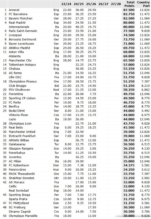 Σύμφωνα με την ειδική κατάταξη της kassiesa.net, που υπολογίζει τους βαθμούς των συλλόγων από το 2023 έως το 2028, ο Ολυμπιακός βρίσκεται στην κορυφή μεταξύ των ομάδων που δεν προέρχονται από τα πέντε μεγάλα πρωταθλήματα (Αγγλία, Ισπανία, Γερμανία, Ιταλία, Γαλλία), ισοβαθμώντας με την Κλαμπ Μπριζ.