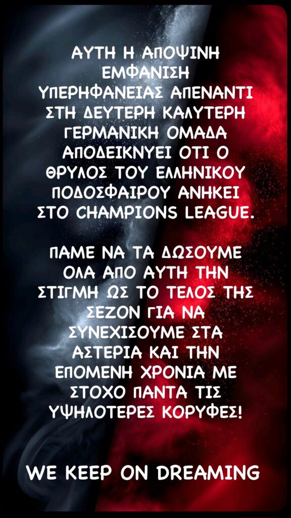 «Αυτή η αποψινή εμφάνιση υπερηφάνειας απέναντι στη Λεβερκούζεν αποδεικνύει ότι ο θρύλος του ελληνικού ποδοσφαίρου ανήκει στο Τσάμπιονς Λιγκ», ανέφερε χαρακτηριστικά, προσθέτοντας ότι οι παίκτες θα τα δώσουν όλα στο πρωτάθλημα, με στόχο να εξασφαλίσουν ξανά τη συμμετοχή στη φάση των ομίλων της κορυφαίας διασυλλογικής διοργάνωσης την επόμενη χρονιά.