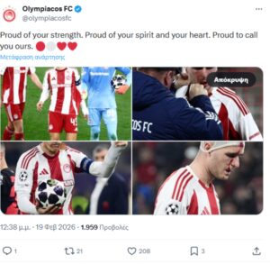 Λίγες ώρες μετά το πέρας του αγώνα και πάρα το αρνητικό αποτέλεσμα η ΠΑΕ Ολυμπιακός ανέβασε στα social media ανάρτηση και μίλησε με τα καλύτερα για τους δύο ποδοσφαιριστές του δηλώνοντας υπερήφανη για τον πνεύμα και την καρδιά τους.