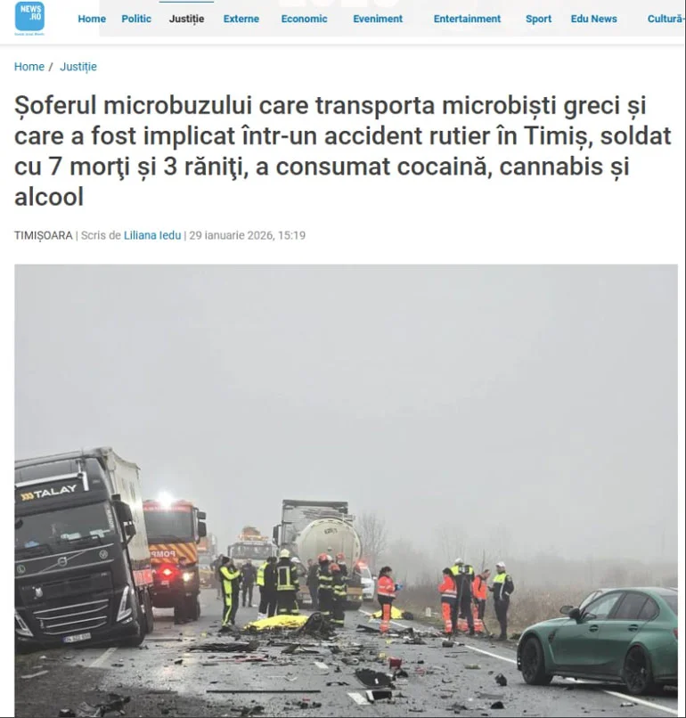 «Οι αναλύσεις που πραγματοποιήθηκαν από τους ανακριτές, έδειξαν ότι ο Έλληνας οδηγός του mini-bus που εμπλέκεται στο τροχαίο δυστύχημα στο Timis, στο οποίο επτά άτομα έχασαν τη ζωή τους και άλλα τρία τραυματίστηκαν, είχε καταναλώσει κάνναβη και κοκαΐνη, αλλά και αλκοόλ. Η τεχνική εξέταση σχετικά με ενδεχόμενο μπλοκάρισμα του τιμονιού κατά τη διάρκεια της προσπέρασης, δεν έχει ολοκληρωθεί.