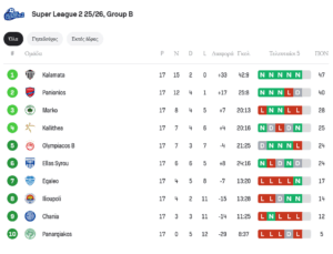 Σήμερα κρίνονται οι τελικές θέσεις του Β’ ομίλου και η μοίρα των ομάδων για τη συνέχεια της σεζόν! Στο παιχνίδι που ξεχωρίζει, ο Πανιώνιος υποδέχεται τα Χανιά στο γήπεδό του σε μια αναμέτρηση που οι «κυανέρυθροι» χρειάζονται τη νίκη για να κρατηθούν στο κυνήγι της πρωτοπόρου Καλαμάτας, η οποία αντιμετωπίζει στο γήπεδο της Ηλιούπολης την Ελλάδας Σύρου, μετά το πρόβλημα που προέκυψε με το γήπεδο της Ερμούπολης. Η Athens Kallithea υποδέχεται την Ηλιούπολη, η Μαρκό τον ουραγό Παναργειακό, ενώ το Αιγάλεω φιλοξενείται από τον Ολυμπιακό Β’.