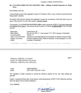Κατά συνέπεια, καλώ την ΠΑΕ ΠΑΣ ΓΙΑΝΝΙΝΑ 1966 να πραγματοποιήσει πληρωμή ύψους CHF 11.500 (έντεκα χιλιάδες πεντακόσια ελβετικά φράγκα). Το ποσό αυτό πρέπει να καταβληθεί έως την 12η Μαρτίου 2026 στον τραπεζικό λογαριασμό του ΥΔΑ: (στοιχεία τράπεζας).